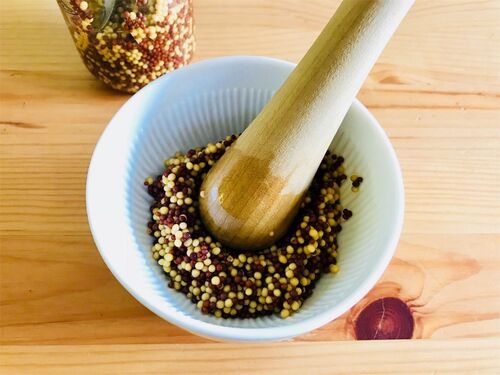 前回までの続きです。 マスタードシードをお酢に漬けて3日くらい経ったら、塩とはちみつで味付けをしてすり鉢でつぶします。 (分量は作り方[1]に書いてあります) 手作業が面倒な方はミキサーを使っても良いです。わたしはつぶつぶの食感を残したいので、すり…
